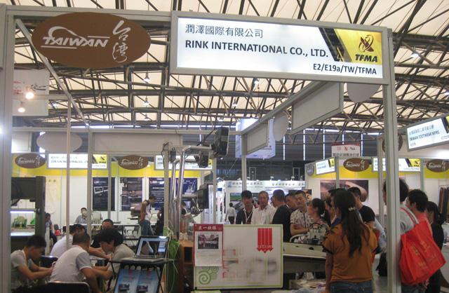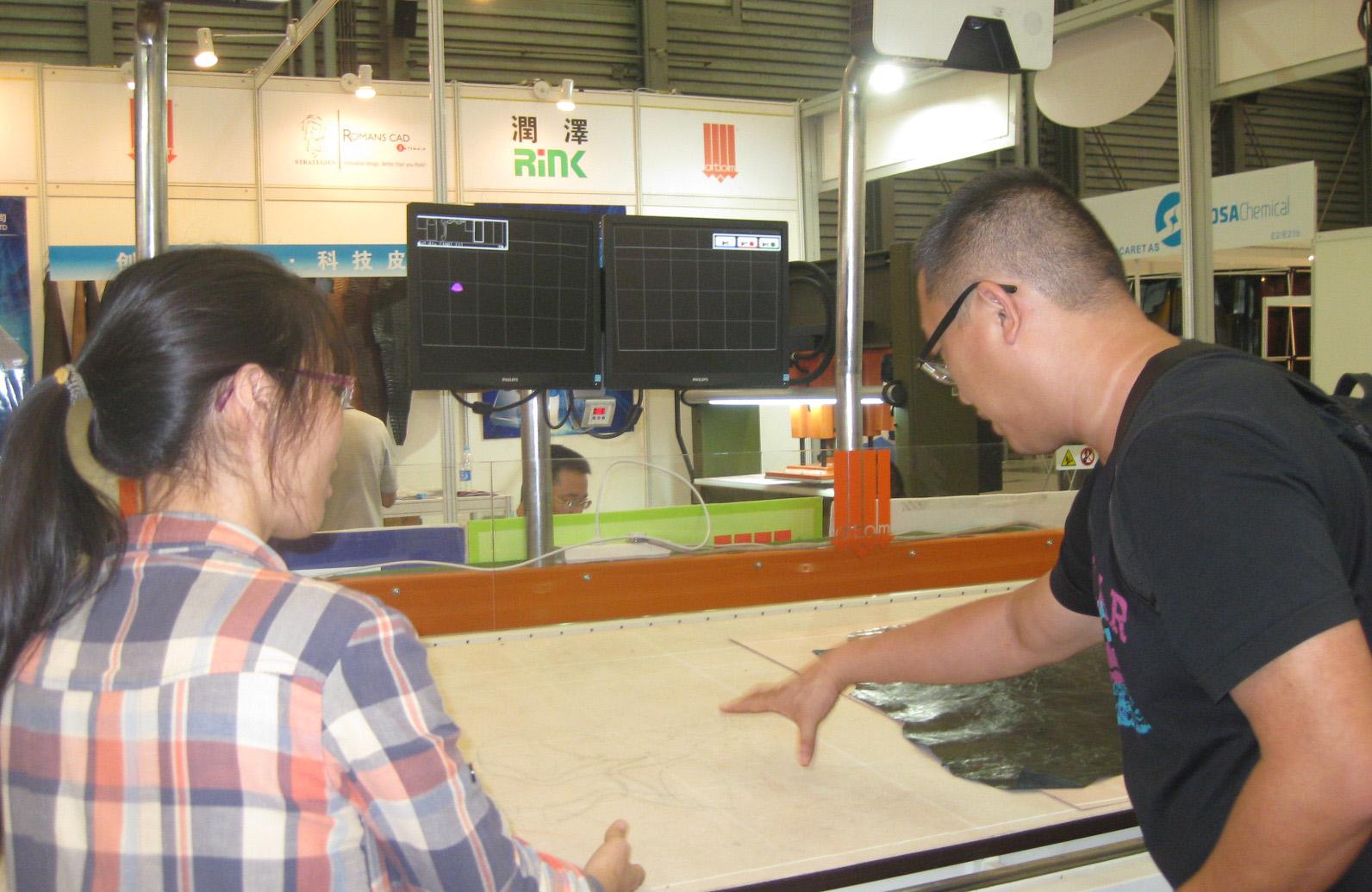 在台湾馆,参展的瑞泽国际有限公司将最新自动化切割机器摆放展台,由工作人员操作,不断展示皮革切割的使用过程和效果。据现场工作人员介绍,这款震动刀头切割机的最大特点就是可以不用斩刀,能够节省投资。
