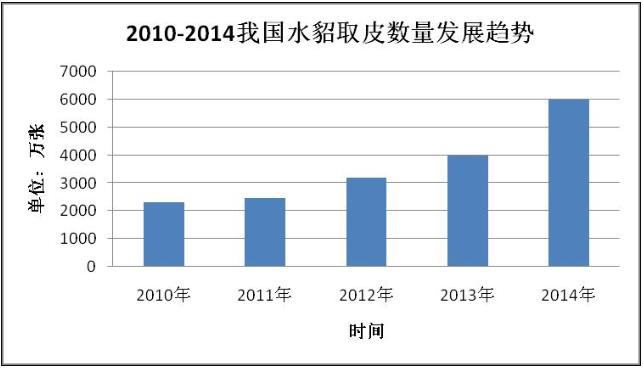 根据2014年统计的水貂取皮6000万张左右计算,比2013年大约增长了50%,是2011年产量的2.58倍。2010-2014我国水貂取皮数量发展趋势如下图: