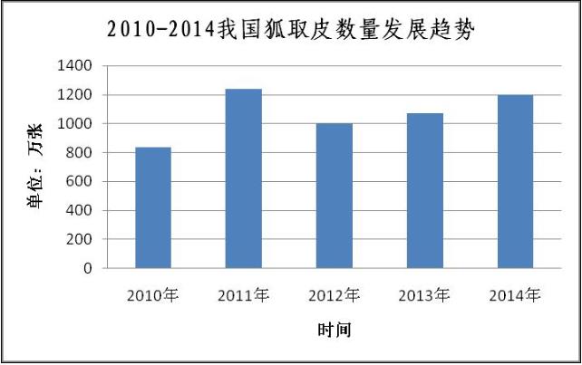2014年我国狐狸取皮数量与2013年相比小幅度增加,根据2014年统计的狐狸取皮1200万张左右计算,大约增长了20%,比2011年产量增长了43.3%。2010-2014我国狐狸取皮数量发展趋势如下图: