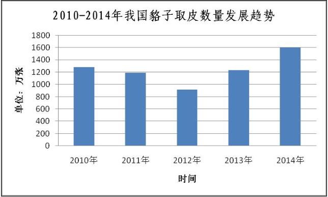 2014年我国貉子取皮数量与2013年相比小幅增加,根据2014年统计的我国貉子取皮1600万张左右数量计算,比2013年大约增加了33.3%,比2011年增长了24.6%。2010-2014年我国貉子取皮数量发展趋势如下图: