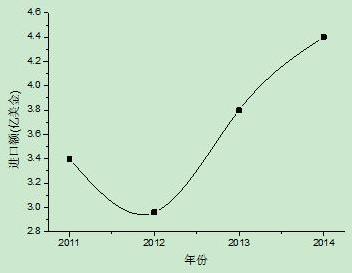 毛皮及制品(不含生毛皮)进口情况虽然有所波动,总体来说还是增长的态势。从2011年的3.4亿美金发展到2014年的4.4亿美金,增长29.4%。