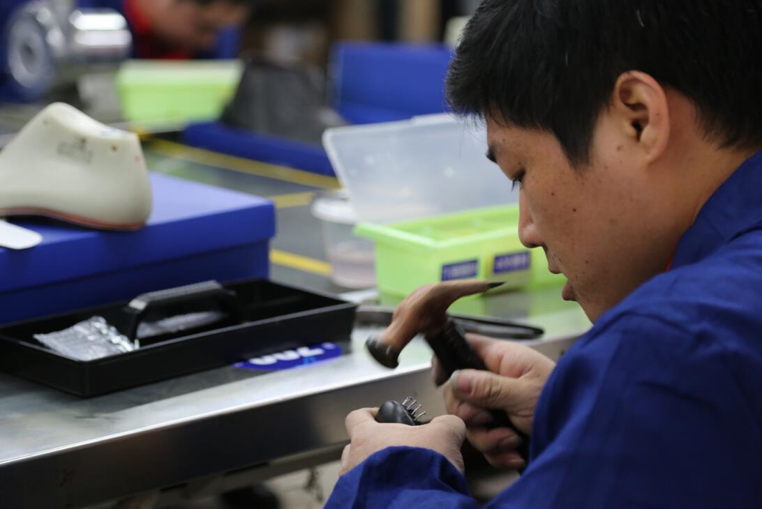 一位参赛选手正在小心翼翼地修整自己的杰作。或许对于手工制鞋匠人而言,这样一双完全经过自己双手完成的皮鞋都是他们的孩子,亲切乖巧,需要细细呵护与宠爱