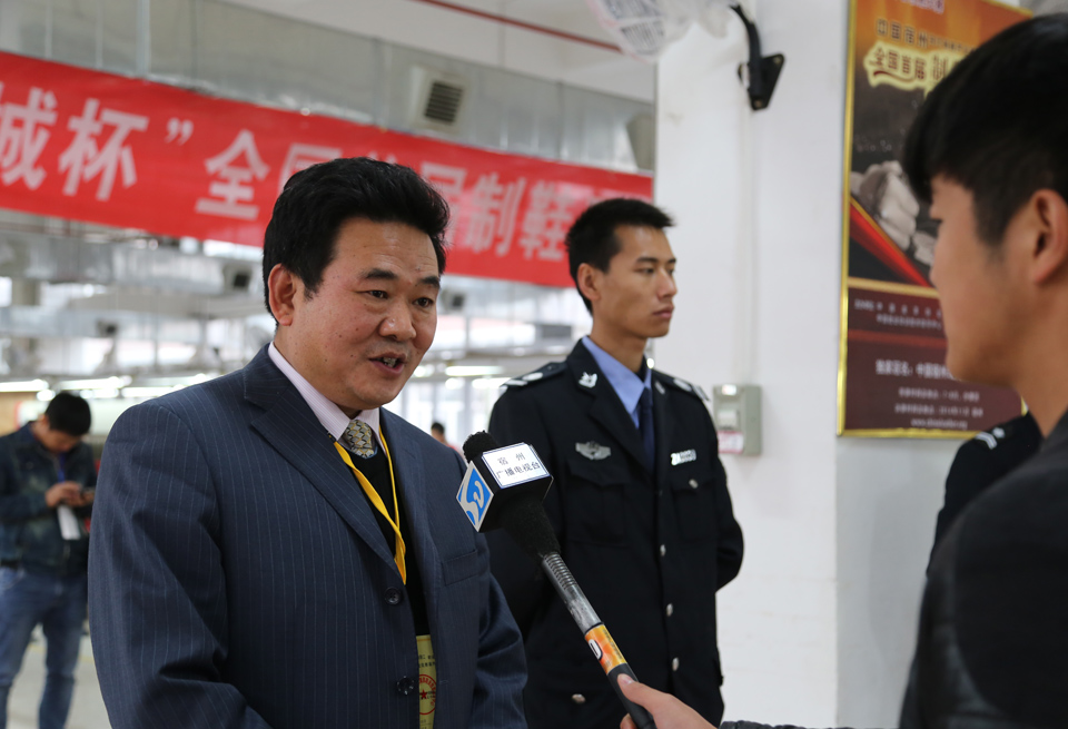 一场制鞋盛宴,吸引了不少媒体争相报道。裁判长正在接受宿州广播电视台的采访。