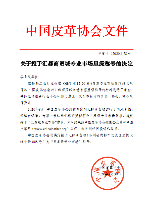 2020年关于授予汇都商贸城专业市场星级称号的决定