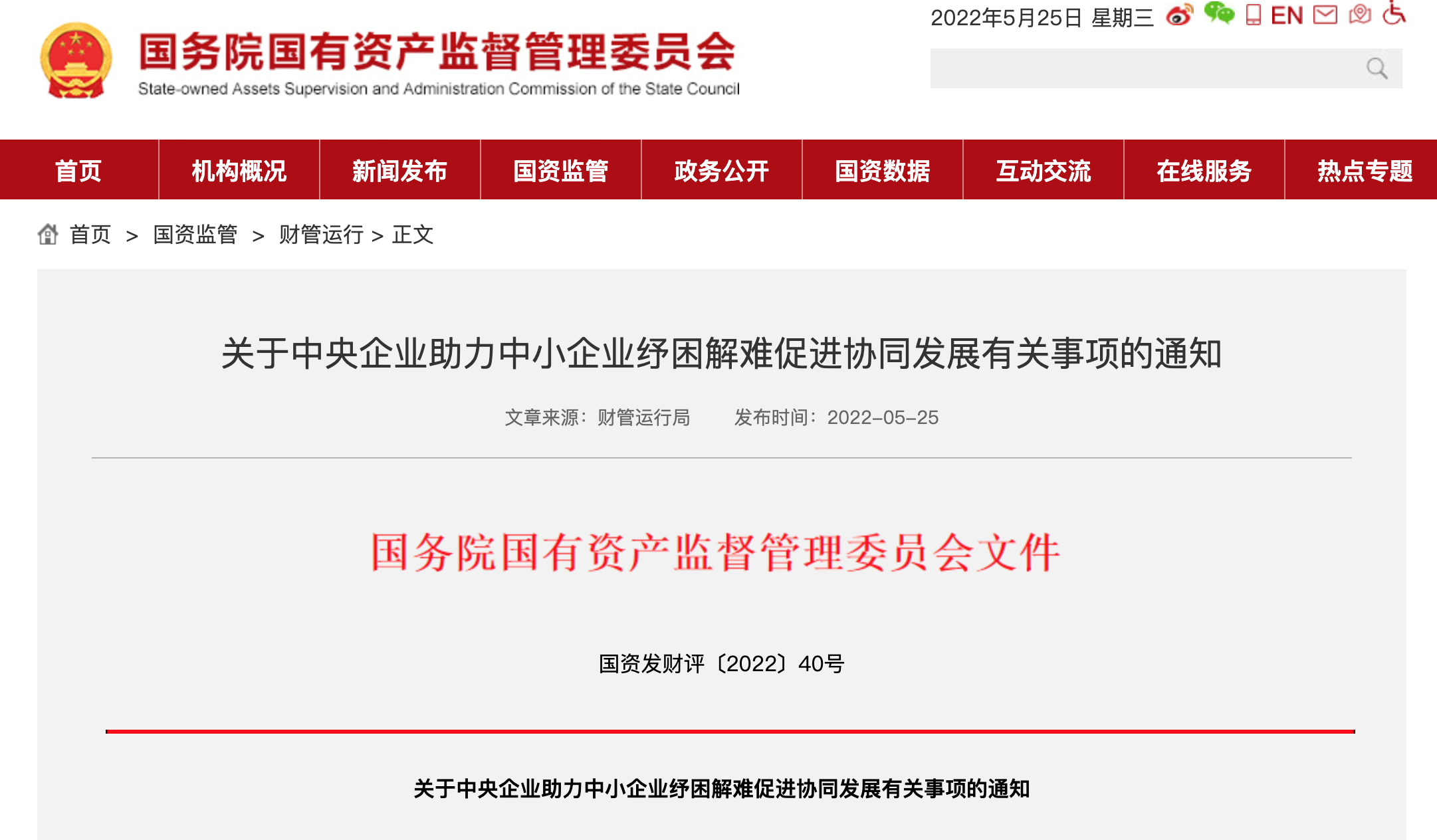 据国资委官网5月25日消息,国资委发布关于中央企业助力中小企业纾困解难促进协同发展有关事项的通知。