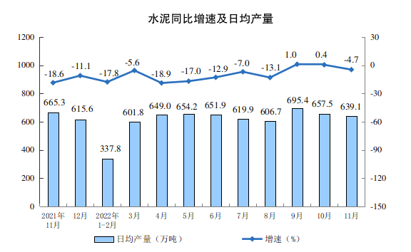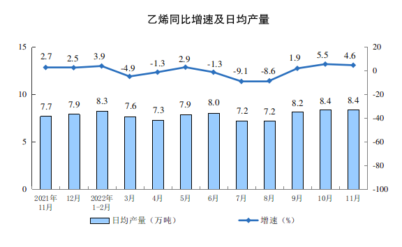 分产品看,11月份,617种产品中有227种产品产量同比增长。钢材10919万吨,同比增长7.1%;水泥19172万吨,下降4.7%;十种有色金属588万吨,增长8.8%;乙烯251万吨,增长4.6%;汽车242.3万辆,下降9.9%,其中新能源汽车75.6万辆,增长60.5%;发电量6667亿千瓦时,增长0.1%;原油加工量5961万吨,增长0.3%。