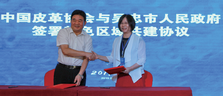 2019 年中国皮革协会李玉中理事长(左)与吴忠市人民政府宋海燕副市长签署共建特色区域协议
