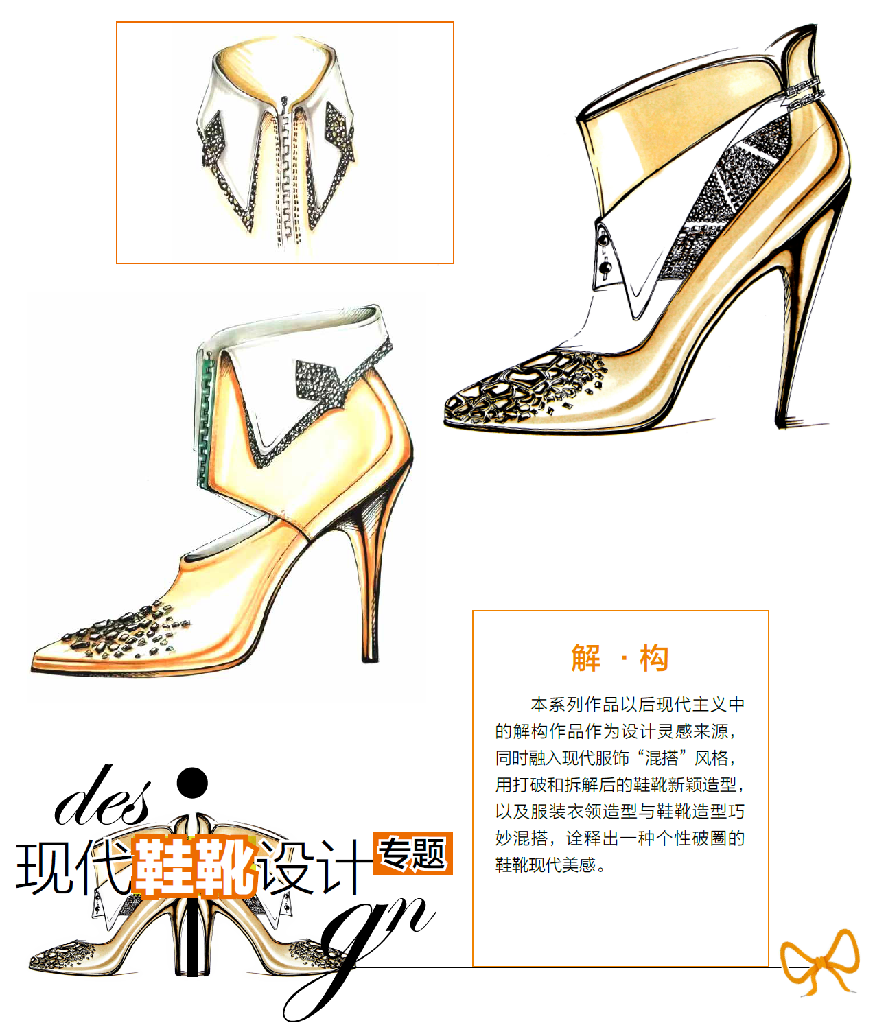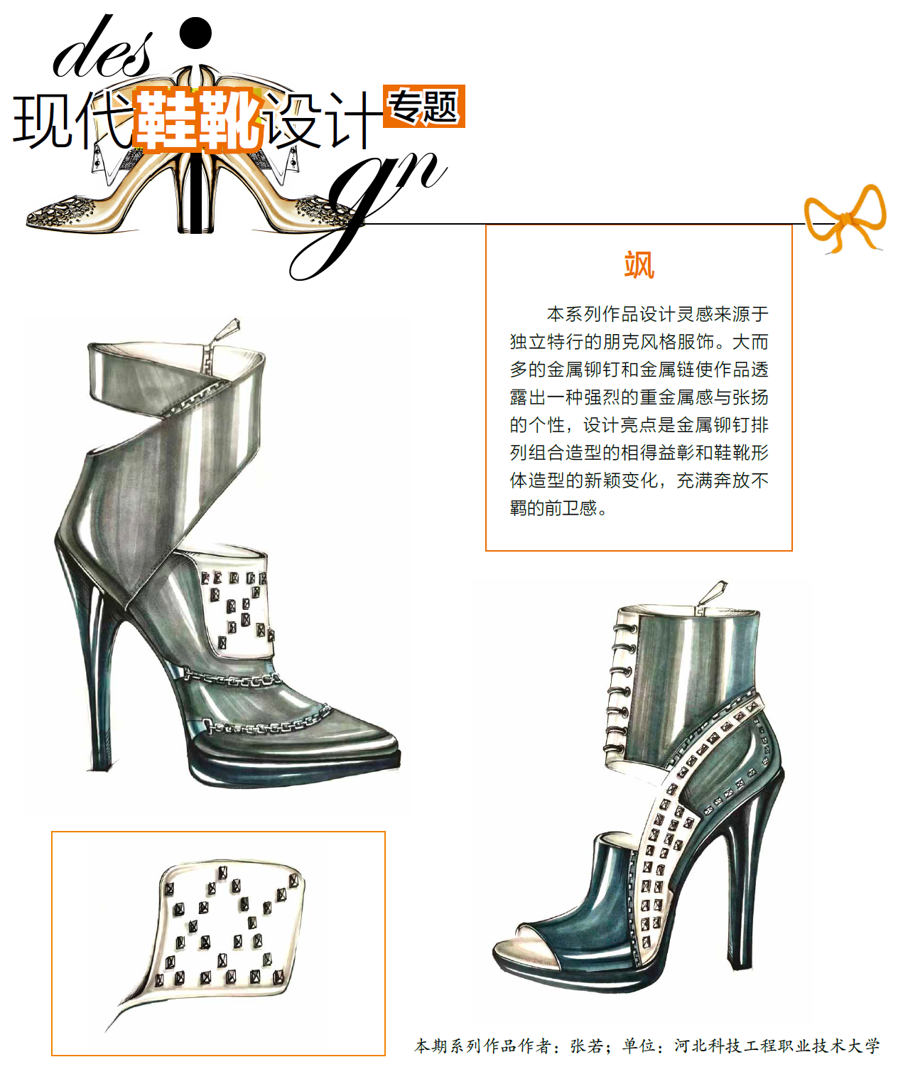 现代鞋靴设计理念、方法(技术)以及鞋靴的主要市场价值,最终都需用其造型(款式)来展示、验证和体现。当然,在鞋靴造型设计过程中,设计师必须首先要满足鞋靴的实用性、市场性(竞争、时尚)、生产性(材料或物料、技术)、盈利性(经营)等方面要求。由此,本专题除了在鞋靴设计理论的研究、探索方面与业内同行进行分享与交流以外,还将通过视觉化的作品设计实践来表现新的设计理念、方法及创意。这些原创鞋靴设计作品可以是实用性的,亦可以是概念性和引领性的。