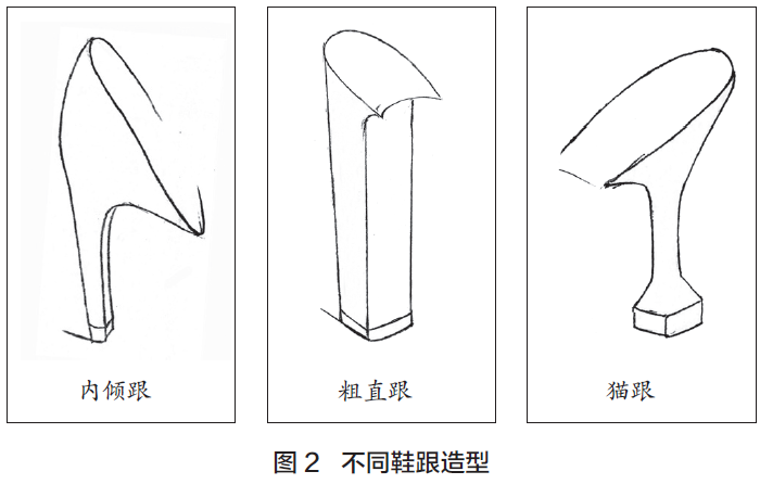 女晚礼鞋的跟型设计除了较多选择细直跟外,还有其它跟型可供选择,常见的有:内倾鞋跟、粗直跟、猫跟、酒杯跟、异形跟等(见图2)。