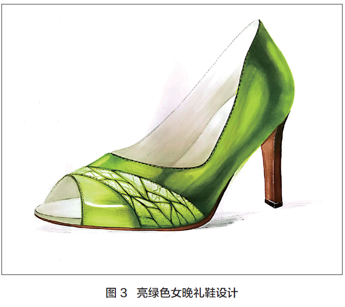 常见女晚礼鞋色彩设计主要有:(1)鲜艳色。作为晚礼服点缀色,可以选择鲜亮的大红色、酒红色、亮黄色、亮绿色、蓝色等,这些颜色可以让女晚礼鞋看上去非常吸引人的眼球(见图3,作者:黄子仪)。(2)柔和色。如果晚礼服属于优雅风格,则可选择与之统一或协调的色彩用于晚礼鞋设计,如:香槟色、鎏光白、卡其色、米色、驼色、棕色、咖啡色、薄荷绿、淡紫色、淡蓝色等低调柔和色彩,可以营造浪漫、柔美的感觉。(3)金属色。如果要营造一种奢华、炫目的风格,女晚礼鞋的色彩设计一般适宜选用具有辉煌感的金属色,如:金色、银色。在实际应用中,金属色与黑色、白色或一些高纯度颜色搭配使用[5],可以更好地表现一种非同凡响的金属质感和奢华感。