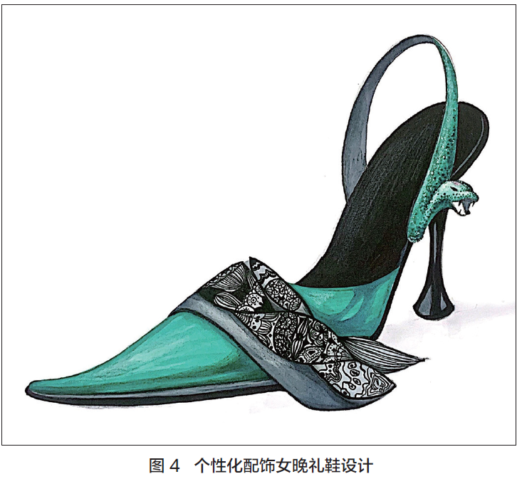 此外,还可借鉴动物造型进行变化,如将蛇、蝴蝶、天鹅等造型配饰应用女晚礼鞋的设计,赋予其一种大自然的灵性。借鉴灵蛇妖娆婀娜外形,将其设计成后袢带,使这款女晚礼鞋呈现出一种神秘象征意义(见图4,作者:黄子仪)。