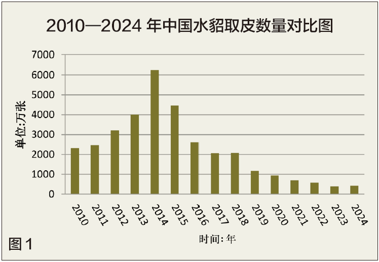2024年中国水貂取皮数量约422万张,与2023年统计数量相比增加了8.67%。从2010年到2024年取皮数量看,2014年水貂取皮数量达到峰值,之后取皮数量总体呈下降趋势。2010—2024年中国水貂取皮数量对比见图1。