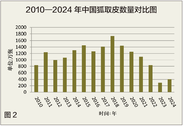 2024年中国狐取皮数量约405万张,与2023年统计数量相比增加了33.69%。从2010年到2024年取皮数量看,2018年以前整体呈起伏状态,2018年取皮数量达到顶峰,2024年取皮数量比2023年有较大幅度上涨。2010—2024年中国狐取皮数量对比见图2。