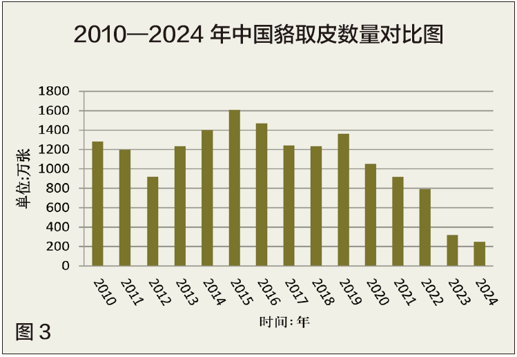 2024年中国貉取皮数量约249万张,与2023年统计数量相比减少了21.65%。从2010年到2024年取皮数量看,整体呈现起伏状态,2019年后取皮数量持续下滑。2010—2024年中国貉取皮数量对比见图3。