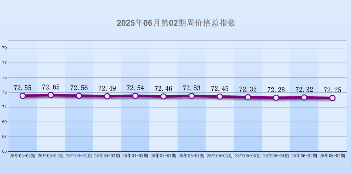 据“中国·海宁皮革指数”信息系统监测,2025年06月第02期周价格总指数报收于72.25点,环比下跌0.07点,环比跌幅0.10%,6大分类涨跌平比例是2:2:2。本周皮革城传统市场销势呈现微幅下跌,其中箱包皮具类、鞋类价量不等量上涨,服装类、服饰类价量不等量下跌,其他类、原材料类价量保持不变。