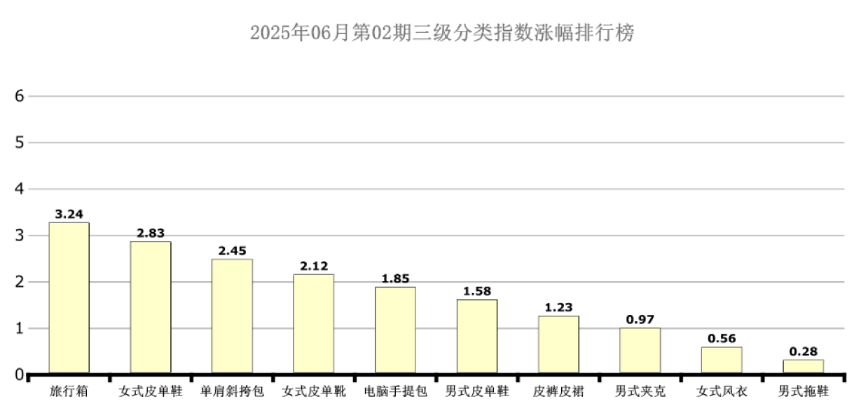 6大分类三级分类中旅行箱、女式皮单鞋、单肩斜挎包、女式皮单靴、电脑手提包、男式皮单鞋、皮裤皮裙、男式夹克、女式风衣、男式拖鞋处于涨幅榜前十列,环比涨幅分别为:3.24点、2.83点、2.45点、2.12点、1.85点、1.58点、1.23点、0.97点、0.56点、0.28点。本期旅行箱、女式皮单鞋、单肩斜挎包、女式皮单靴、电脑手提包、男式皮单鞋、男式拖鞋均呈现止跌反弹态势。