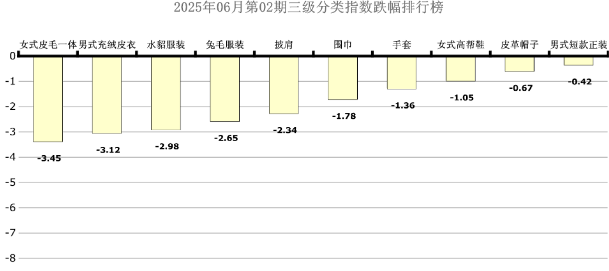 6大分类三级分类中女式皮毛一体、男式充绒皮衣、水貂服装、兔毛服装、披肩、围巾、手套、女式高帮鞋、皮革帽子、男式短款正装处于跌幅榜前十列,环比跌幅分别为:3.45点、3.12点、2.98点、2.65点、2.34点、1.78点、1.36点、1.05点、0.67点、0.42点。本期兔毛服装、披肩、围巾、手套、男士短款正装均呈现涨后回落态势。