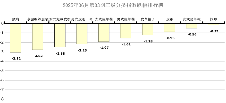 6大分类三级分类中披肩、水貂编织服装、女式充绒皮衣、男式皮毛一体、女式皮单鞋、男式皮单鞋、皮草帽子、皮带、女式皮单靴、围巾处于跌幅榜前十列,环比跌幅分别为:3.12点、2.83点、2.58点、2.25点、1.97点、1.62点、1.28点、0.95点、0.56点、0.23点。本期女式皮单鞋、男式皮单鞋、女式皮单靴均呈现涨后回落态势。