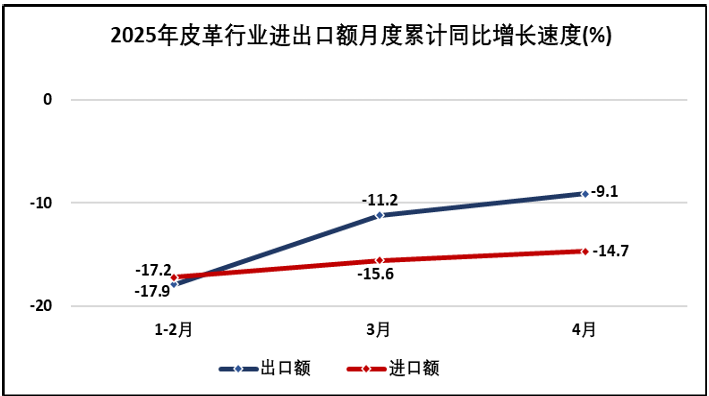 一、1—4月全国皮革行业进出口总额降幅继续收窄