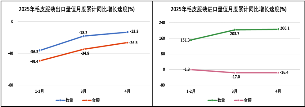 1—4月,全国出口皮革服装122.7万件,出口额2,715.2万美元(出口单价 22.1 美元/件,同比提高82.7%);进口皮革服装4.9万件,进口额3,266.5万美 元。