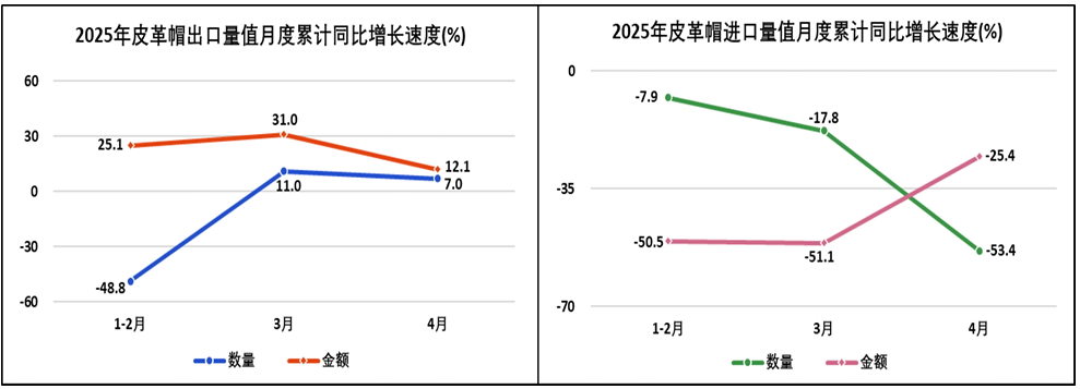 1—4月,全国出口皮革帽8.4万顶,出口额43.4万美元;进口皮革帽1,696 顶,进口额17.5万美元(进口单价103.3美元/顶,同比增长60.0%)。