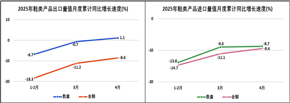 1—4月,全国出口鞋类产品29.0亿双,出口额137.5亿美元;进口鞋类产品 0.61 亿双,进口额17.2亿美元。