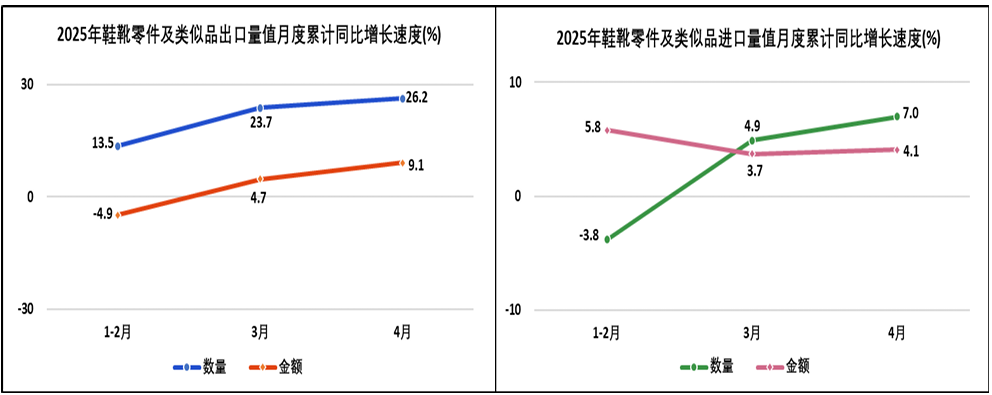1—4月,全国出口靴鞋零件及类似品15.5万吨,出口额14.0亿美元;进口靴 鞋零件及类似品2,512.8吨,进口额7,643.5万美元。
