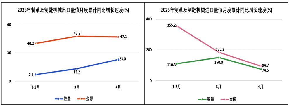 1—4月,全国出口制革及制鞋机械8.8万台,出口额1.8亿美元;进口制革 及制鞋机械239台,进口额555.9万美元。