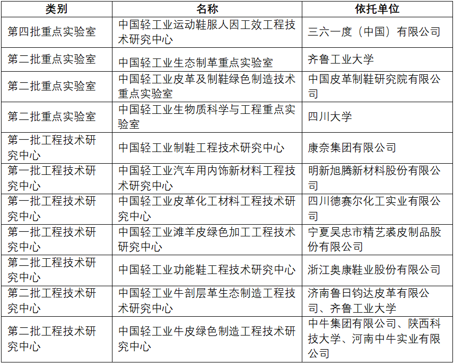 会议同时公布了第四批轻工重点实验室和工程中心名单,三六一度(中国)有限公司“中国轻工业运动鞋服人因工效工程技术研究中心”入围。此外齐鲁工业大学“中国轻工业生态制革重点实验室”等第一、二批重点实验室和工程中心通过复评,具体名单如下: