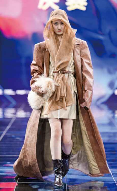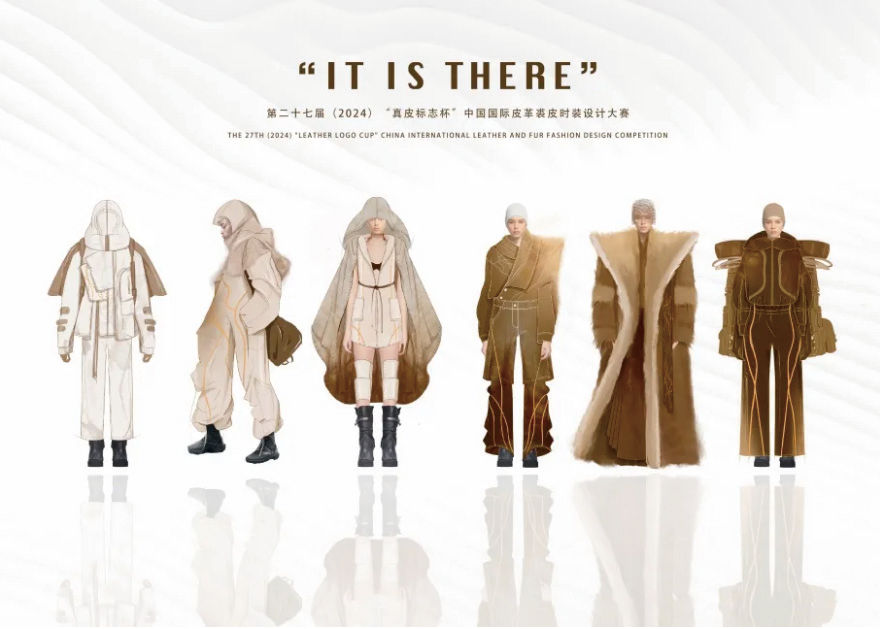 第二十七届(2024)“真皮标志杯”中国国际 皮革裘皮时装设计大赛的成功举办,不仅是创意与 匠心交融的璀璨展现,更涌现了一大批优秀的设计 人才,大赛圆满落幕的背后离不开学校老师的宝贵 指导和各合作企业的鼎力相助,让众多优秀设计作 品被更多人看到。 “你为什么要登山?因为山就在那里”,这是 清华大学研究生魏佳欣很喜欢的一句话。山作为自 然界中的存在,它静静地矗立在那里,对人们来说 设计赏析 PART 10 是一种自然的吸引和挑战。徒步登山,感受户外给予 的奇妙治愈能力,勇敢追求自然与自由,魏佳欣由此 获得灵感,创作的《IT IS THERE》在第二十七届(2024) “真皮标志杯”中国国际皮革裘皮时装设计大赛中荣 获金奖及视频传播奖。 《IT IS THERE》的设计理念将原始“游牧文化” 和现代“徒步时尚”进行融合,原始“游牧文化”代 表了人类最早的探险精神和自由生活的方式,徒步作 为连接元素,不仅代表着旅行和探险,更象征着一个 人在生活中的不断前行和发展。“游牧和徒步是我喜 欢的两个风格,我想做一次尝试把两者融合,希望传 达出一种融合传统和现代的时尚态度,强调追求自由、 探索未知及个性表达的重要性。”魏佳欣表示。为契 合大赛主题“智融”,魏佳欣将传统文化与现代时尚 融于作品之中,一方面选择游牧文化和徒步中的大地 色作为主要色彩来源,用以表现山川、风沙及原野色 系,提取饱和度高的亮橙色作为点缀,匹配“城市边缘” 的色彩方向;另一方面用皮革、皮草、毛毡、纱等多 种材料拼接,进行廓形提取,营造游牧民族服装风格, 呼应西北地区特色。