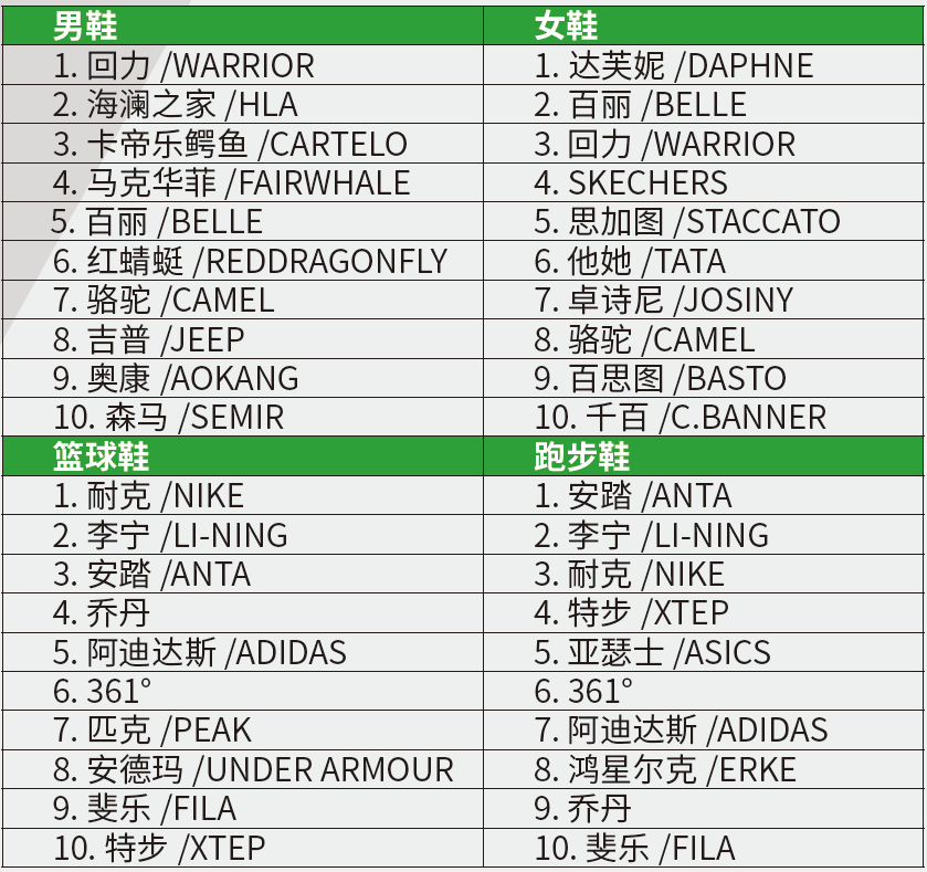 1. 九月鞋类前十排行榜