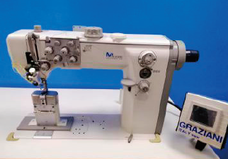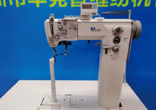 2、G867-40R柱式单针三同步厚料缝纫机。使用德国杜克普机头,机器柱高400mm,柱直径45mm,机器带有自动抬压脚、自动倒缝、气动松线功能,带有安全离合器,内置打线机,可调交替压脚冲程最大达9mm,缝速可达2000转/分钟,适用于箱包、鞋子等一些小部位的特殊工艺操作。