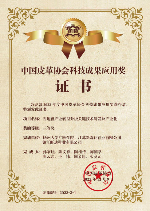 雪地靴有关项目荣获中国皮革协会科技成果应用奖三等奖