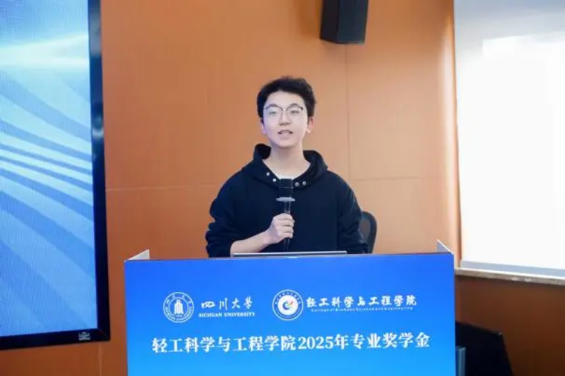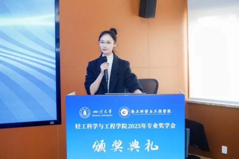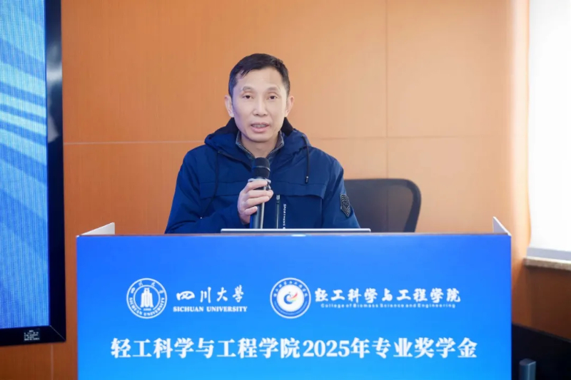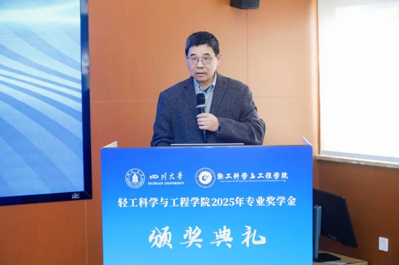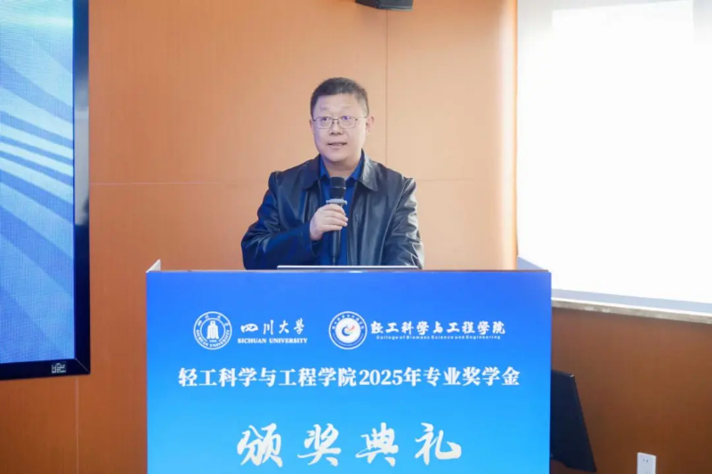 11月28日下午,四川大学轻工科学与工程学院2025年专业奖学金颁奖典礼在皮革楼互联网中心举行。中国皮革协会副理事长陈占光、德国司马化学有限公司皮革部中国区总经理张建华、斯塔尔精细涂料有限公司皮革事业部中国区区域销售经理涂刚、天津春发生物科技集团有限公司项目经理董婷等企业嘉宾,学院党委书记李天富、院长彭必雨,副院长周建飞、迟原龙等院领导,生物质与皮革工程系系主任林炜、副系主任程海明,食品工程系系主任吕远平等,与全体获奖师生共同参加典礼。学院党委副书记姜新主持。