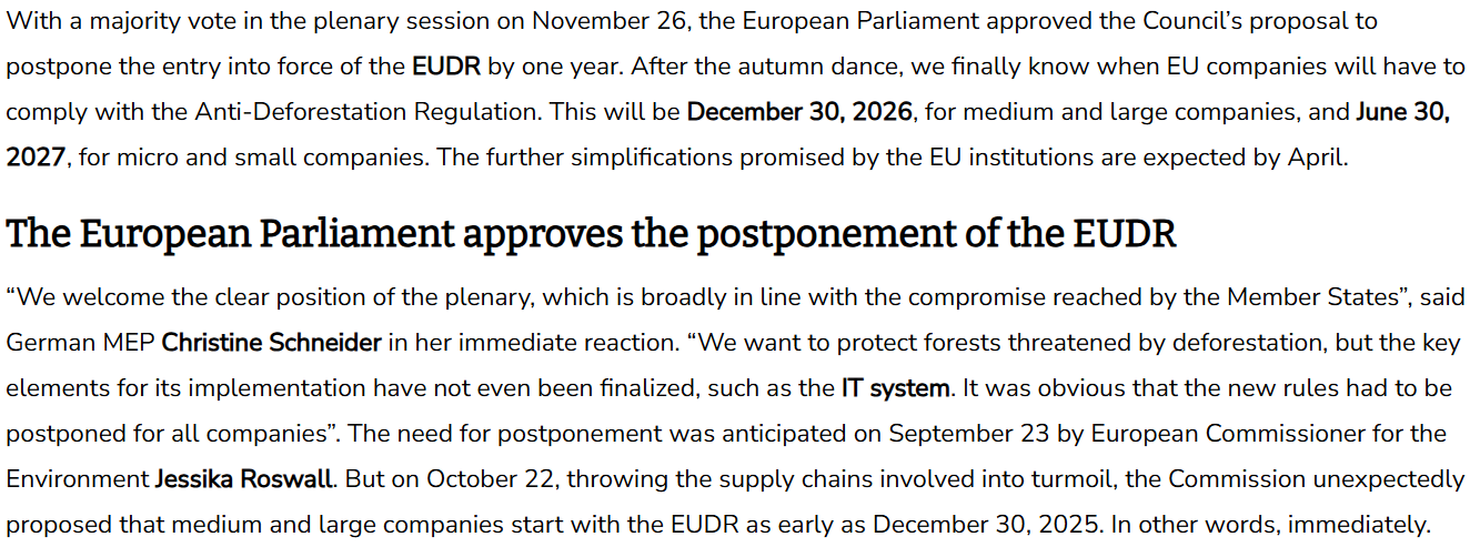 The European Parliament approves the proposal: the EUDR is postponed to 2027