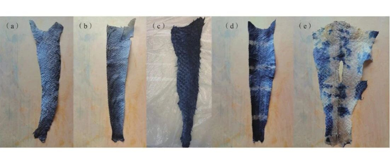 图6 鱼皮染色实验最终效果 (a) 湿涂染;(b) 干涂染;(c) 完全浸染;(d) 条纹扎染;(e) 折叠扎染