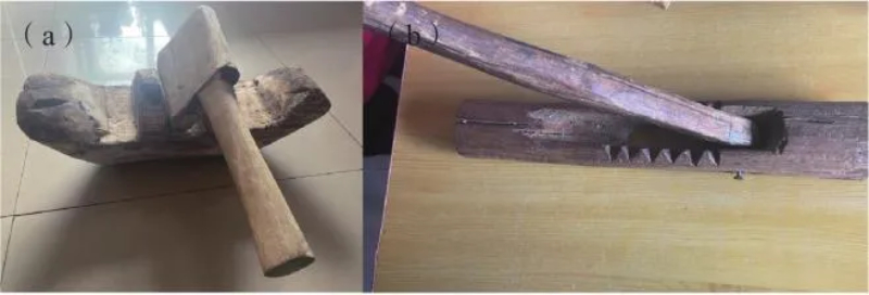 图4 鞣制熟化鱼皮的工具 (a) 木槌;(b) 木铡刀