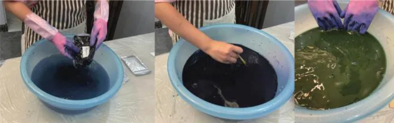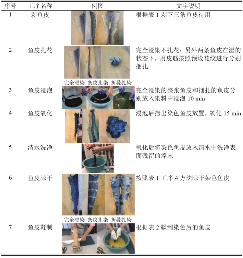 纵观赫哲族鱼皮染色服饰的兴衰历程,发现染色鱼皮装饰的发展历经三个阶段,由鱼皮服饰边缘装饰、鱼皮服饰衣身染色装饰至鱼皮染色纹样装饰而发展,体现了赫哲先民由生存意识向审美追求及形成民族特色的演变。通过对赫哲族鱼皮植物染色工序的抢救与探索实践可知,剥鱼皮工艺和鱼皮鞣制熟化工艺是赫哲族国家级非遗鱼皮制作技艺的精髓,尤其鱼皮鞣制熟化工艺是使鱼皮变得柔软的关键,由此也发现了赫哲族早期的鱼皮植物涂染会产生掉色和上色欠佳的原因。根据鱼皮湿涂染、干涂染和浸染的染色实践工序,印证浸染方式更适用于鱼皮植物染色,鱼皮浸染的基本工序为:剥鱼皮→浸染→鱼皮晾干→鞣制鱼皮,由此法染色的鱼皮不易掉色,鞣制后的染色鱼皮柔软,可应用于服饰制作。鱼皮浸染方式还丰富了鱼皮植物染色的多元化,可融合扎染、夹染等植物染色方式。鱼皮植物染色技艺的重现,有望推动赫哲族非遗文化的创新性发展与创造性转化。