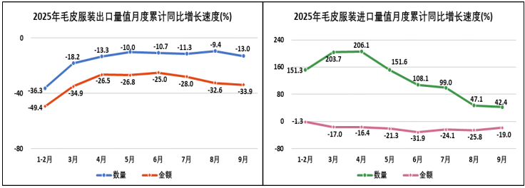 1—9月,全国出口毛皮服装54.7万件,出口额1.3亿美元;进口毛皮服装2.1万件,进口额3,204.0万美元(进口单价1,514.3美元/件,同比下降43.1%)。