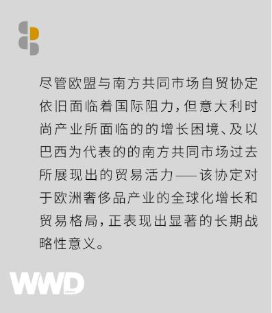 意大利时尚配饰联盟主席 Giovanna Ceolini 向 WWD 表示:“欧盟与南方共同市场的贸易协定,对时尚配饰行业而言是具有战略意义的关键一步。开拓新市场能够为我们的企业创造大量发展机遇。”