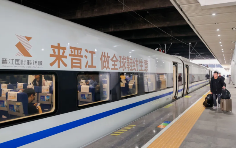 当天中午12点44分,一列身披“来晋江 做全球鞋纺生意”标识的和谐号动车组正式启动。此次冠名列车始发站广州东,终点站浙江上虞南,将高频次穿梭于广东、福建、浙江三大鞋业核心产区,运行车次共计146个,精准串联广州、东莞、深圳、晋江、温州、台州、绍兴等20余个制造与商贸重镇,运行周期将完整覆盖2026年春运大流量及春季广交会、晋江国际鞋体博会等关键行业节点。