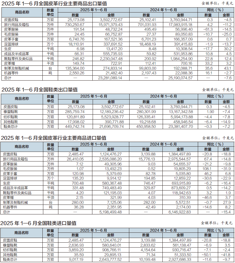 1—6月,全国出口皮面皮鞋2.5亿双,出口额35.9亿美元;进口皮面皮鞋2,485.5万双,进口额11.2亿美元。