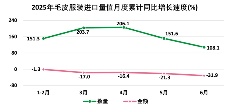 1—6月,全国出口毛皮服装24.5万件,出口额6,675.3万美元;进口毛皮服装1.1万件,进口额1,349.2万美元(进口单价1,257.2美元/件,同比下降67.3%)。