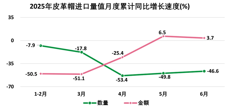 1—6月,全国出口皮革帽15.0万顶,出口额72.3万美元;进口皮革帽2,153顶,进口额32.2万美元(进口单价149.6美元/顶,同比增长94.3%)。