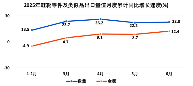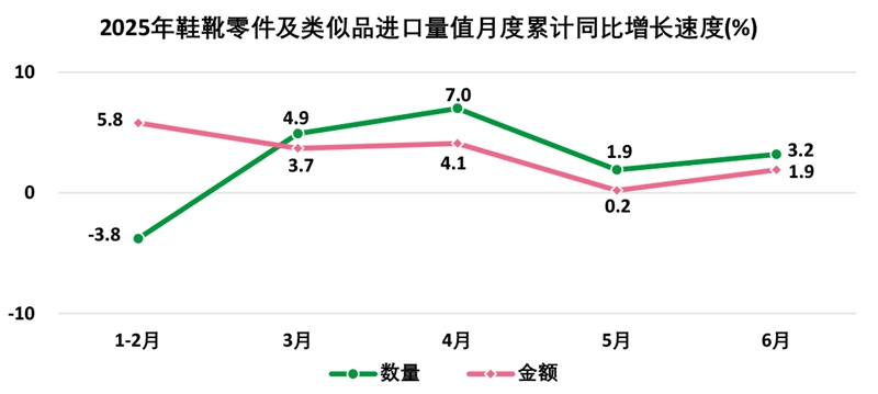 1—6月,全国出口靴鞋零件及类似品24.7万吨,出口额22.3亿美元;进口靴鞋零件及类似品4,203.3吨,进口额1.2亿美元。
