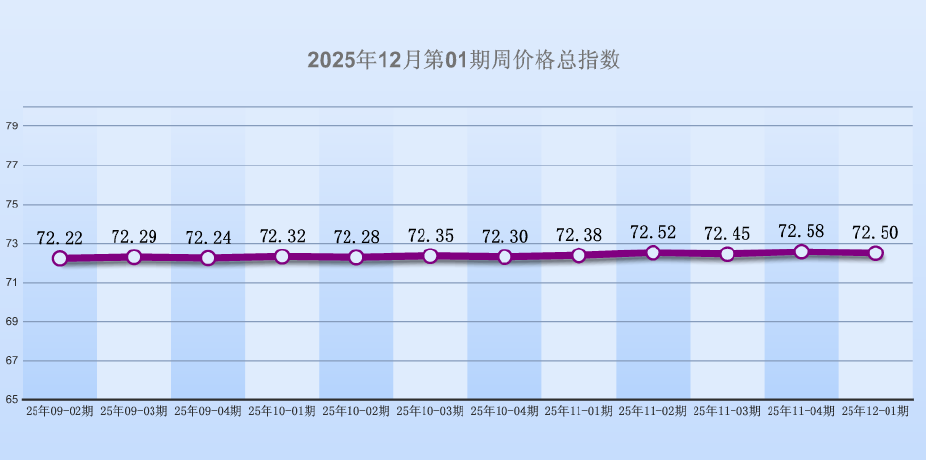 据“中国·海宁皮革指数”信息系统监测,2025年112月第01期周价格总指数报收于72.50点,环比下跌0.08点,环比跌幅0.11%,6大分类涨跌平比例是3:2:1。本周皮革城传统市场销势呈现微幅下跌,其中箱包皮具类、鞋类价量不等量上涨,服装类、服饰类、其他类价量不等量下跌,原材料类价量保持不变。