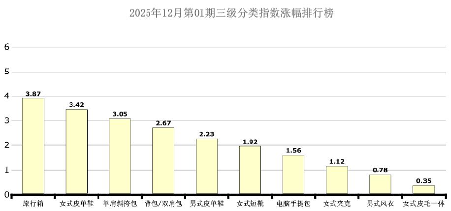 6大分类三级分类中旅行箱、女式皮单鞋、单肩斜挎包、背包/双肩包、男式皮单鞋、女式短靴、电脑手提包、女式夹克、男式风衣、女式皮毛一体处于涨幅榜前十列,环比涨幅分别为:3.87点、3.42点、3.05点、2.67点、2.23点、1.92点、1.56点、1.12点、0.78点、0.35点。本期旅行箱、女式皮单鞋、单肩斜挎包、背包/双肩包、男式皮单鞋、女式短靴、电脑手提包、女式夹克、男式风衣均呈现止跌反弹态势。