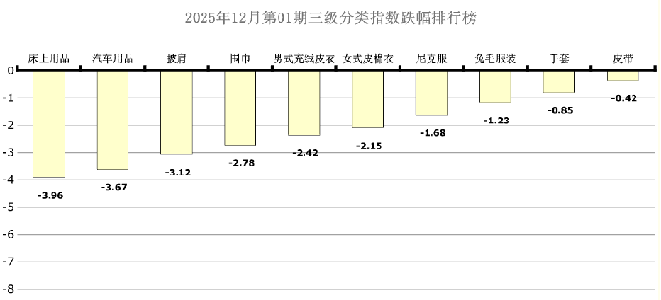 6大分类三级分类中床上用品、汽车用品、披肩、围巾、男式充绒皮衣、女式皮棉衣、尼克服、兔毛服装、手套、皮带处于跌幅榜前十列,环比跌幅分别为:3.96点、3.67点、3.12点、2.78点、2.42点、2.15点、1.68点、1.23点、0.85点、0.42点。本期披肩、围巾、男式充绒皮衣、女式皮棉衣、尼克服、兔毛服装、手套、皮带均呈现涨后回落态势。