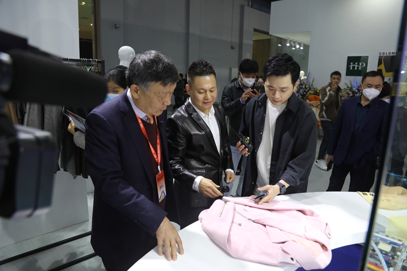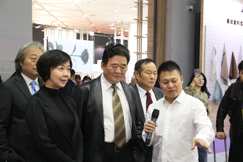 孙宗训向中国轻工业联合会副会长、中国皮革协会理事长李玉中左三)介绍公司产品