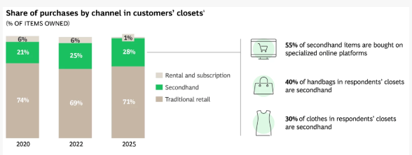 受访者问卷结果显示,他们近28%的衣橱物品为二手购入,较往年显著增长。其中超过一半(55%)的二手购买行为发生在 Vestiaire Collective、The RealReal 或 Vinted 等线上多品牌二手交易平台,凸显了数字渠道在推动二手消费普及方面发挥的核心作用。